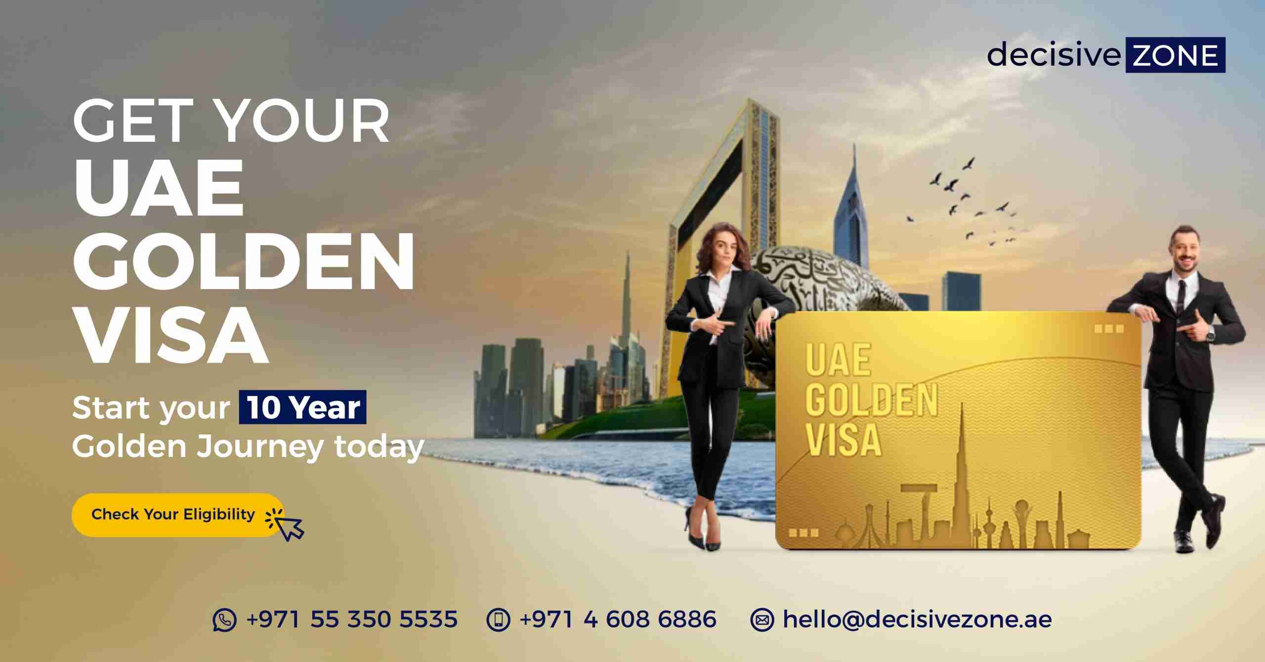 | Unlock Your Future in the UAE | | 6 Reasons the Golden Visa is Your Key: Discover the freedom and opportunities that await you with a long-term residency solution in a thriving, dynamic nation. | | | | 1 | Long-Term Residency | | Enjoy 10 years of residency peace of mind, allowing you to build a stable life, invest in your future, and create lasting memories with loved ones. | | | | | 2 | Business Opportunities | | Establish or expand your business without local sponsorships. Thrive in Dubai's vibrant economy and chase your entrepreneurial dreams. | | | | | 3 | Travel Benefits | | Explore the world effortlessly with unlimited travel outside the UAE. Leverage Dubai's central location and connectivity to reach new horizons. | | | | | 4 | Property Ownership | | Invest in your future by owning property in a vibrant and stable market. | | | | | 5 | Retirement Planning & Family Support | | The Golden Visa unlocks your dream retirement haven, while allowing you to sponsor your family and domestic workers to live and work with you, building a strong support system and enjoying life together. | | | | | 6 | World-Class Education | | Give your children access to elite schools and universities offering globally recognized programs, investing in their bright future. | | | | |